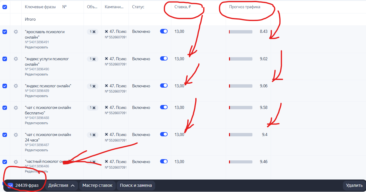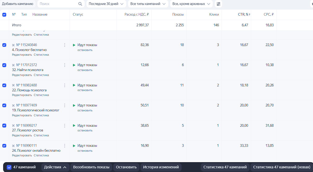 - Полностью настроенную и протестированную мной рекламную кампанию для привлечения клиентов на психологические услуги по параметрам, указанным выше.